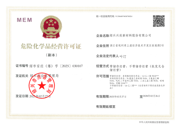 紹興興欣新材料股份有限公司成立于2002年06月27日,占地面積122畝,位于杭州灣上虞經濟技術開發區拓展路2號,現有職工200余人,專業技術人員50余人;博士、碩士研究生30余人組成的一支知識型、專業化的技術科研團隊。公司面向全球市場,專業開發電子化學品、環保化學品、醫藥中間體、高分子材料等先進新材料重點領域的省級科技型企業;建有浙江上虞、安徽東至兩個生產基地。目前為“國家高新技術企業”、浙江省“隱形冠軍”企業、浙江省專精特新中小企業;建有“省級”研究開發中心,共建天津大學浙江紹興研究院電子化學品研發中心。